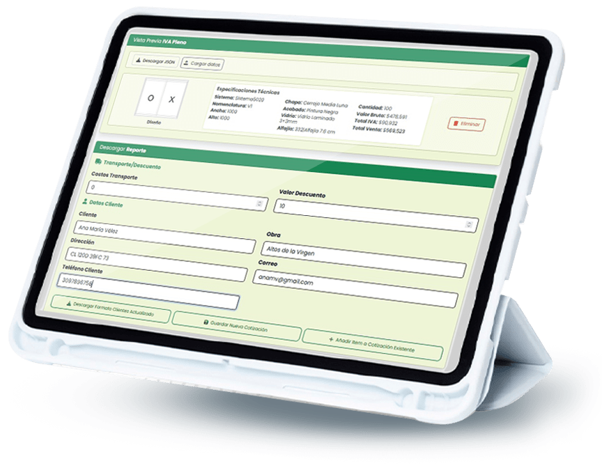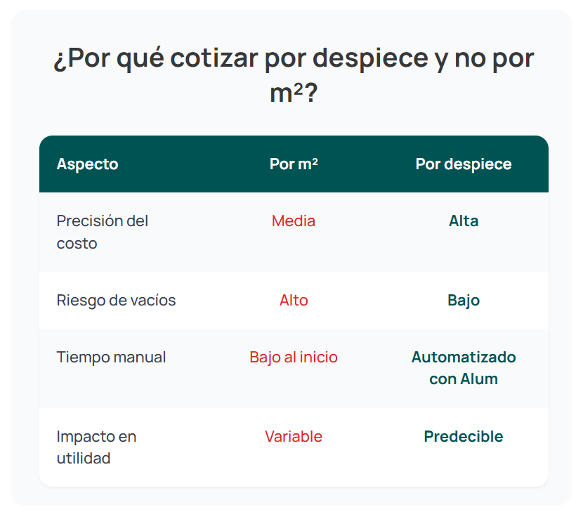 Alum automatiza la cotización, genera despieces precisos y optimiza el uso de perfiles para que entregues más rápido, con menos desperdicio y mayor rentabilidad.